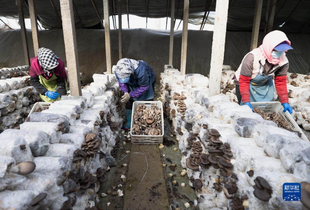 2月15日,河北省唐山市豐南區東田莊鄉大吳莊村的農民在大棚內采摘平菇。