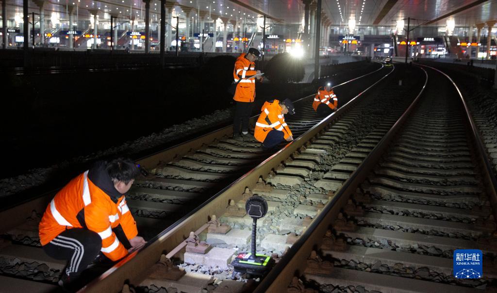 2月15日凌晨,中國鐵路上海局集團有限公司南京橋工段的鐵路檢修人員在南京南站對線(xiàn)路進(jìn)行檢測。