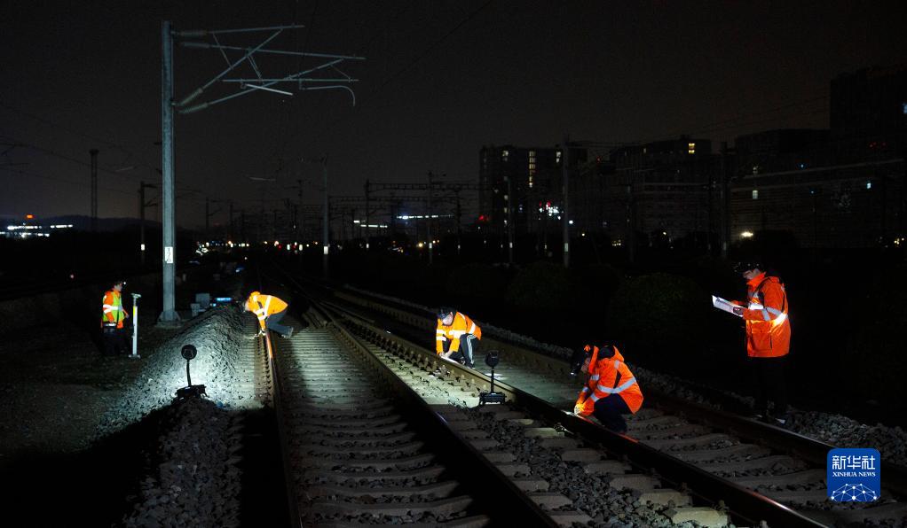2月15日凌晨,中國鐵路上海局集團有限公司南京橋工段的鐵路檢修人員在南京南站對線(xiàn)路進(jìn)行檢測。