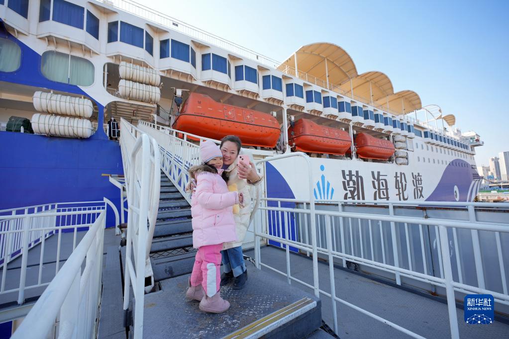 2月15日,在山東港口煙臺港,一對母女在登船舷梯上合影。
