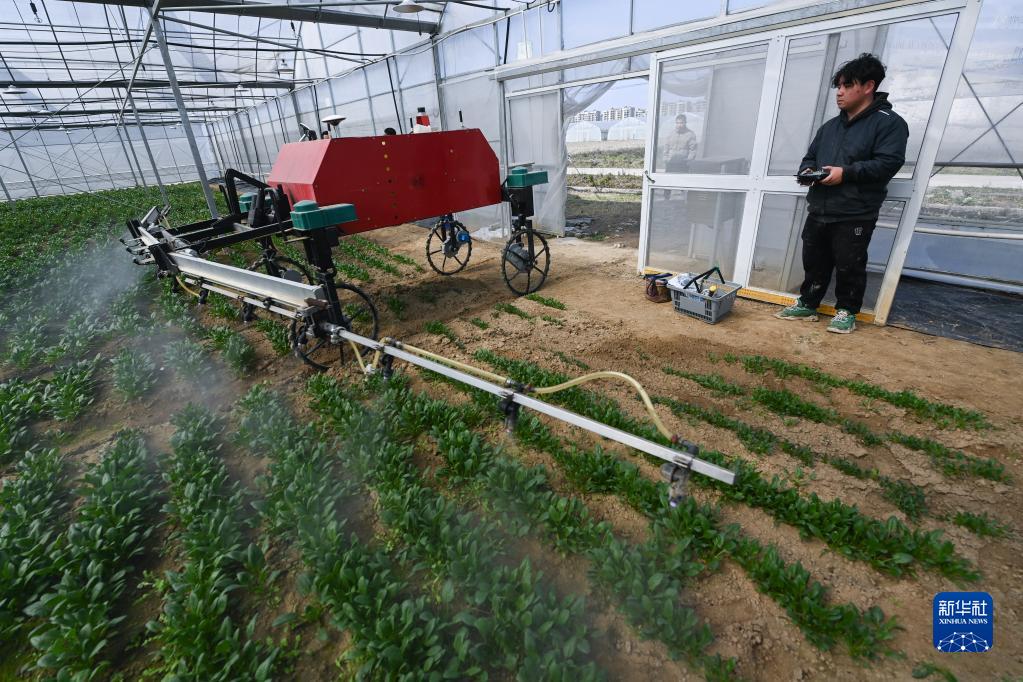 2月15日,在浙江省嘉興市南湖區鳳橋鎮一個(gè)有機農業(yè)園的蔬菜大棚內,工作人員遙控操作植保機器人進(jìn)行施肥作業(yè)。該農業(yè)園配備數字化智慧農業(yè)系統,引進(jìn)農業(yè)機器人進(jìn)行施肥、澆水、翻耕、播種、植保等農事工作。