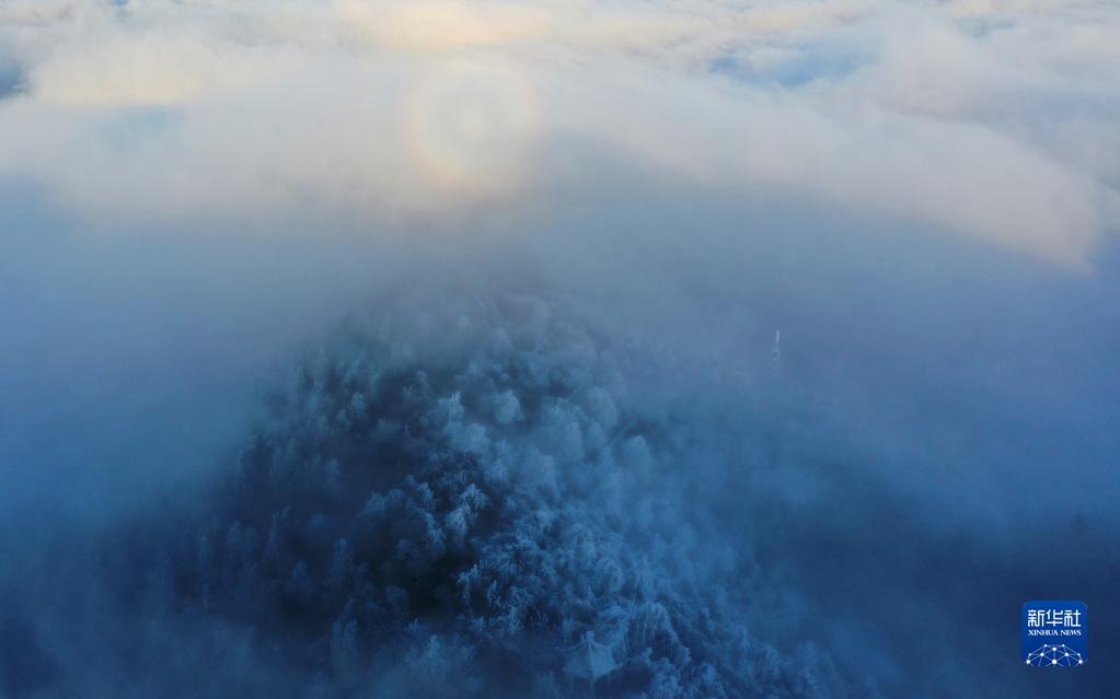 當日,湖南省衡陽(yáng)市南岳衡山風(fēng)景區雪后初霽,晶瑩剔透的霧凇在云海里若隱若現,景色如畫(huà)。