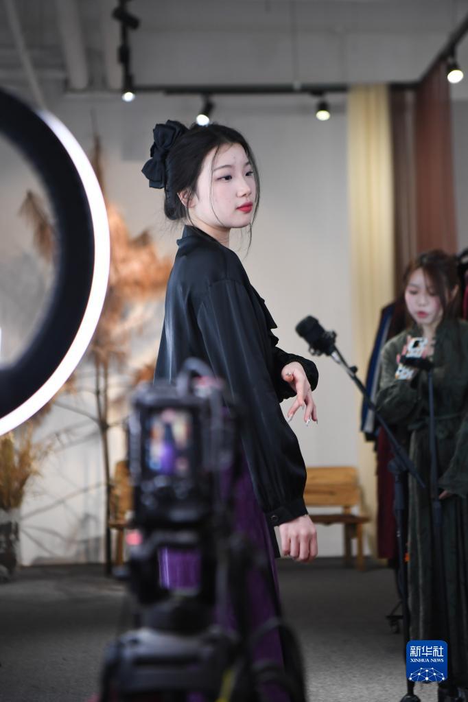2月14日,主播在湖南省株洲市蘆淞區的湖南素白服飾有限公司直播銷(xiāo)售服裝。