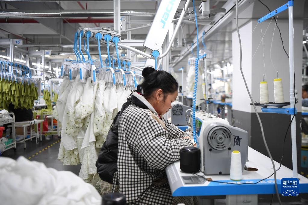 2月15日,工人在湖南尊睿服飾有限公司車(chē)間生產(chǎn)服裝。