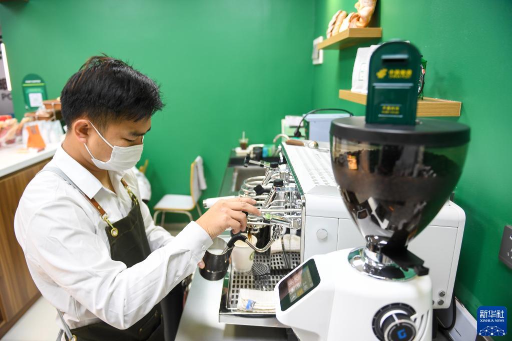 2月15日,咖啡師在深圳咖啡主題郵局制作咖啡。