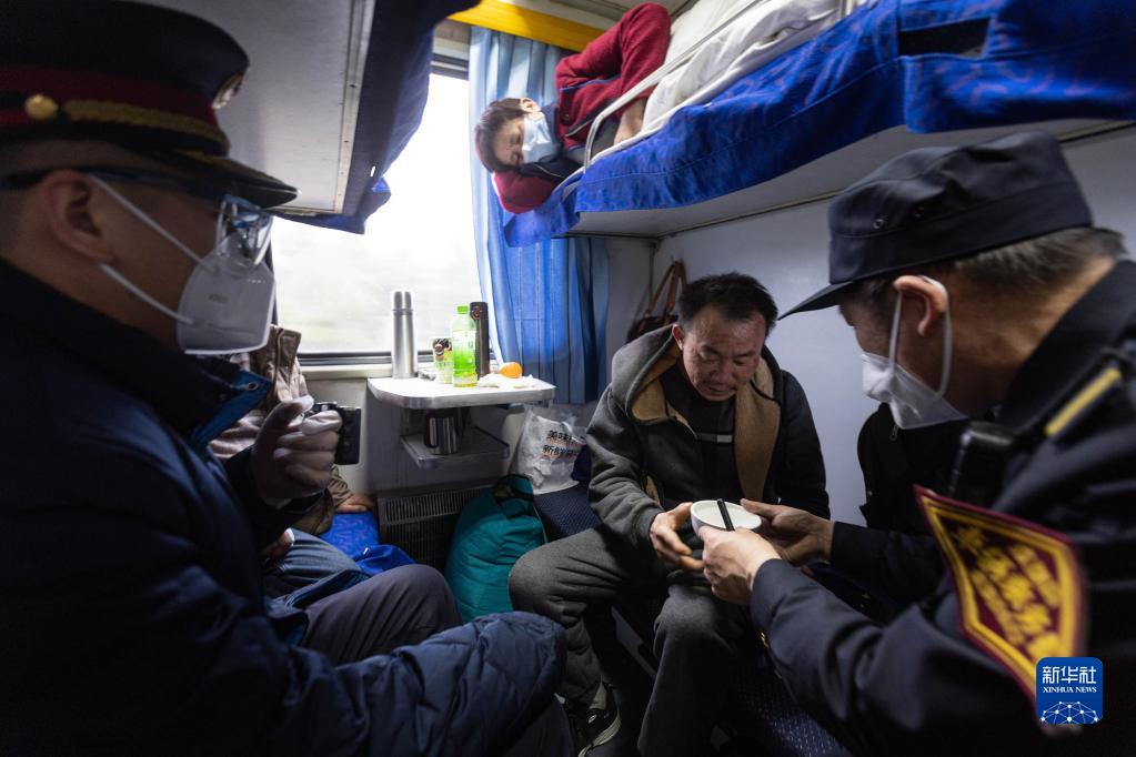 2月14日,車(chē)輛乘務(wù)員李金文(右一)在照顧一名身體不適的乘客。
