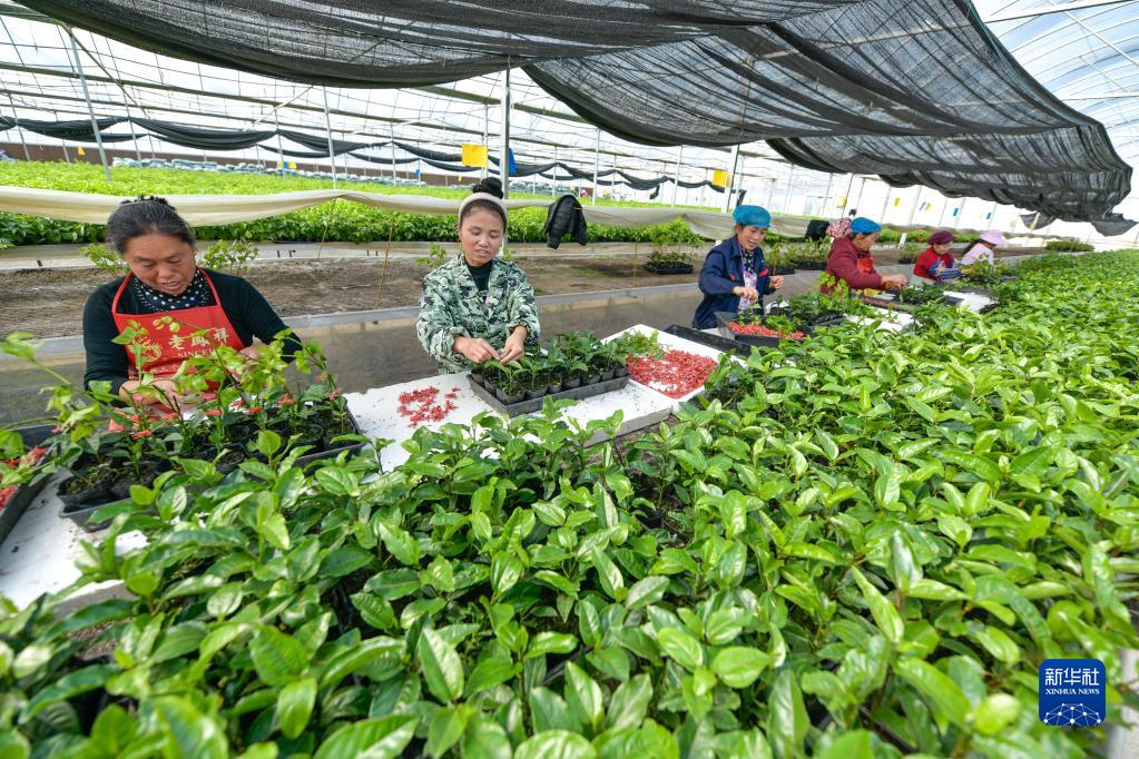 2月15日,工人在貴州省從江縣貫洞鎮百香果育苗基地嫁接百香果苗。