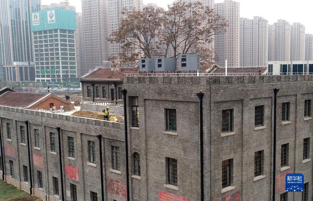 2月15日,工人對石家莊市新華區正太飯店進(jìn)行改造升級(無(wú)人機照片)。