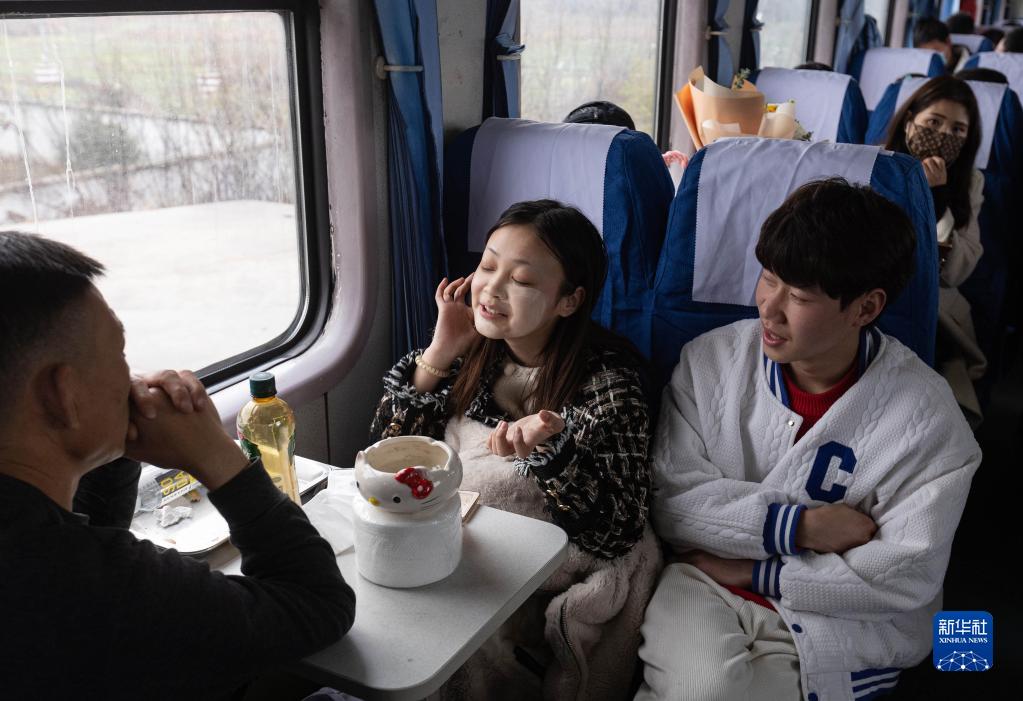 2月14日,在臨客K4618次列車(chē)上,一名女乘客在敷面膜。