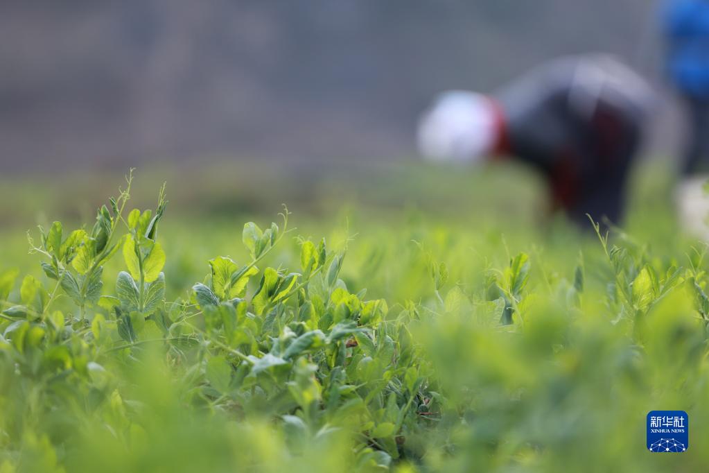 2月15日,在龍里縣灣灘河鎮郊外,菜農在采摘豌豆尖。
