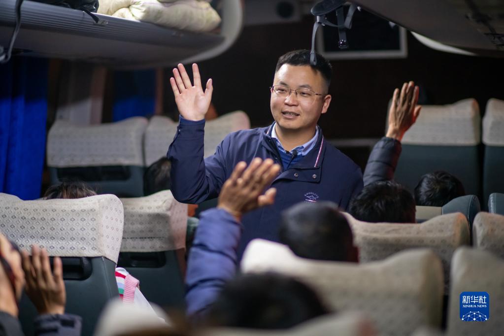 在云南省曲靖市麒麟區人力資源服務(wù)產(chǎn)業(yè)園內,全國人大代表袁海波與準備出發(fā)的務(wù)工人員道別(2月12日攝)。新華社記者 江文耀 攝