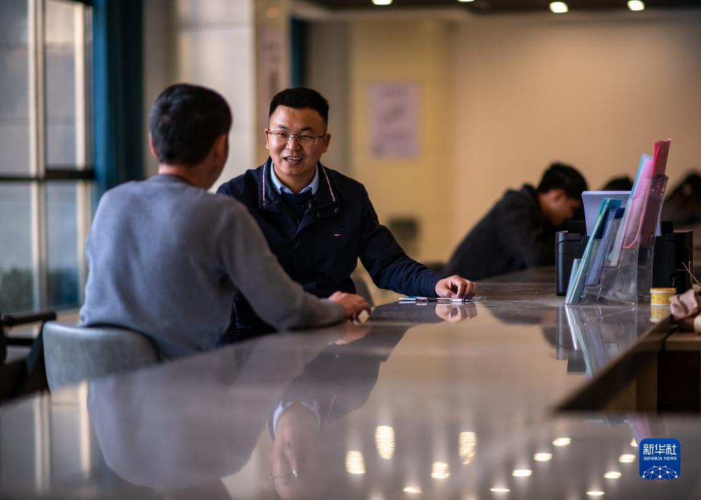 在云南省曲靖市麒麟區人力資源服務(wù)產(chǎn)業(yè)園內,全國人大代表袁海波(右)與準備出發(fā)的務(wù)工人員聊天(2月11日攝)。新華社記者 江文耀 攝