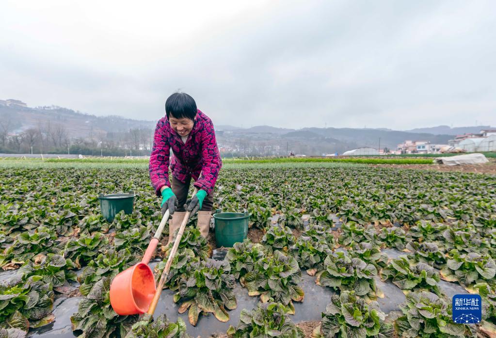 2月15日,村民在貴州省六盤(pán)水市鐘山區大河鎮大橋村蔬菜基地為蔬菜施肥。