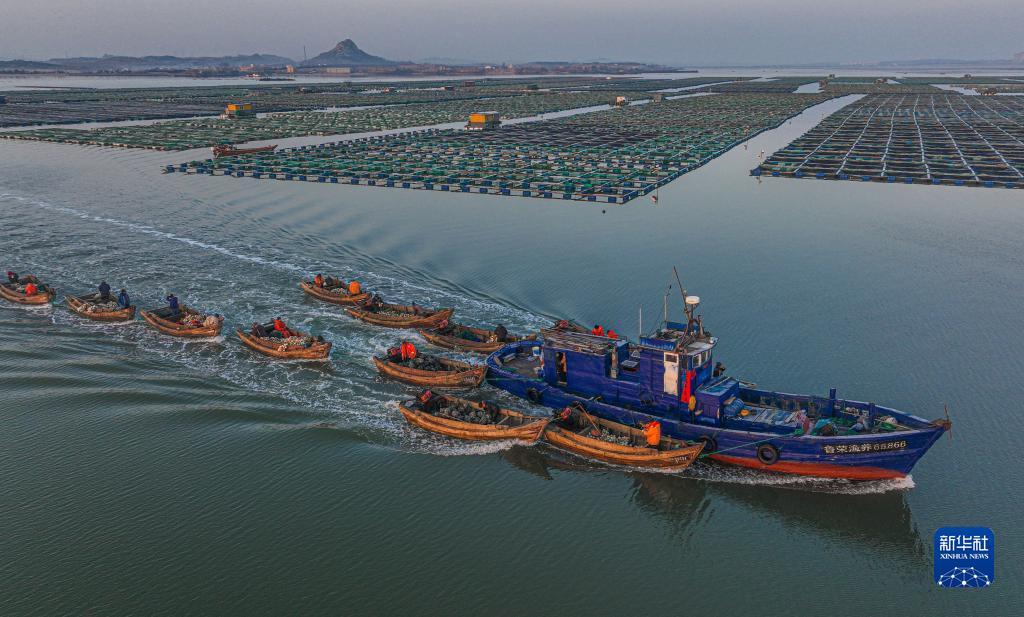 2月16日,在榮成市石島管理區桑溝灣海洋牧場(chǎng)網(wǎng)箱養殖區,漁民駕駛漁船出海作業(yè)(無(wú)人機照片)。