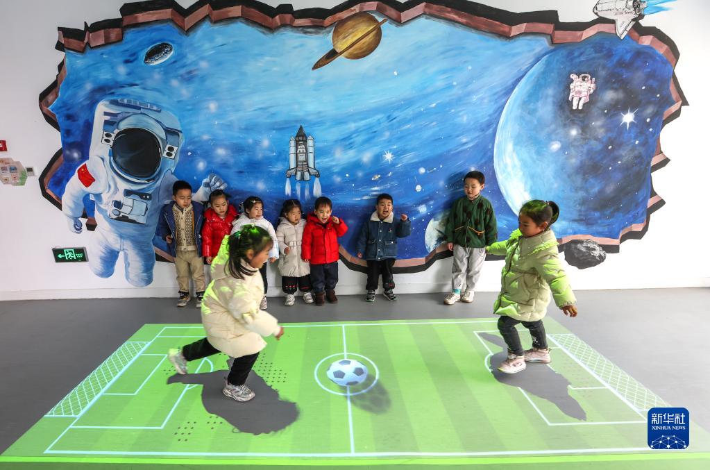 2月15日,在常州市新北區龍虎塘街道中心幼兒園(盤(pán)龍新區)游戲共享部落,小朋友們在進(jìn)行模擬足球對抗賽游戲。