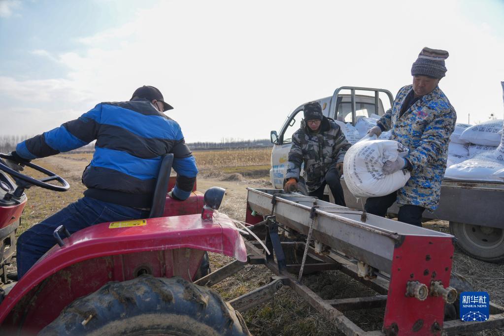 2月15日,山東省威海市文登區金農會(huì )農業(yè)專(zhuān)業(yè)合作社員工為農機器具添加化肥。