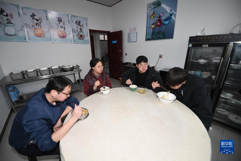 楊鑫博(左二)和同事在項目部食堂吃飯(2月15日攝)。