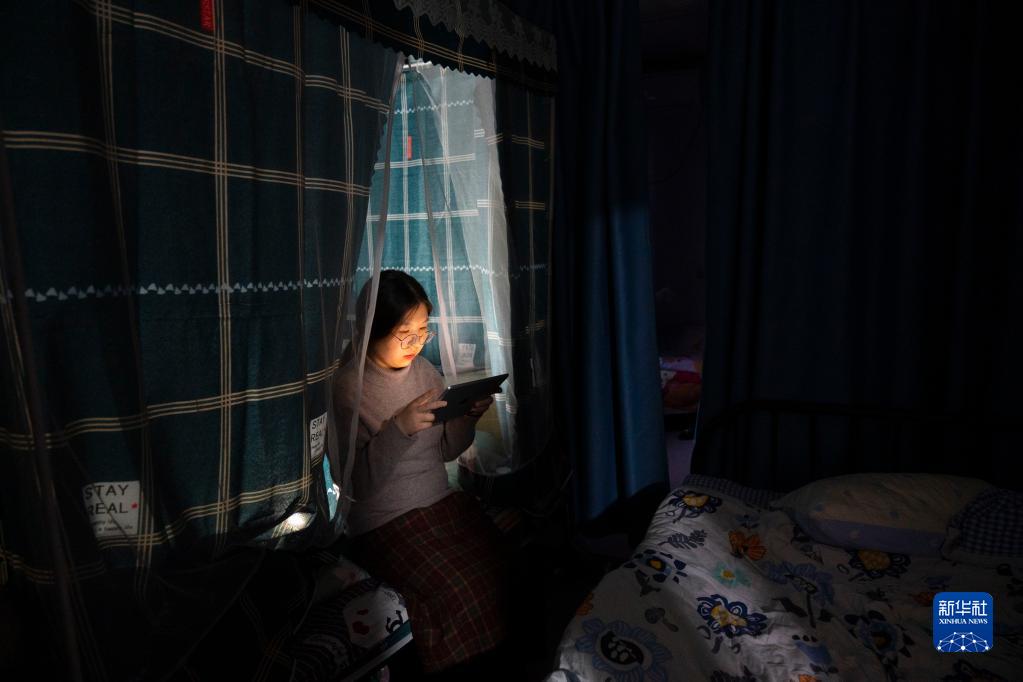 楊鑫博在項目部宿舍玩網(wǎng)絡(luò )游戲(2月15日攝)。