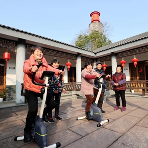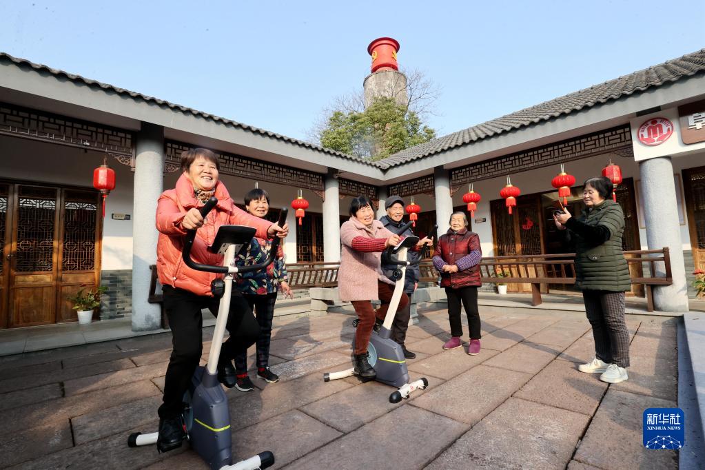 2月16日,在湖州市德清縣阜溪街道興山未來(lái)社區居家養老服務(wù)中心,社區老人在健身鍛煉。