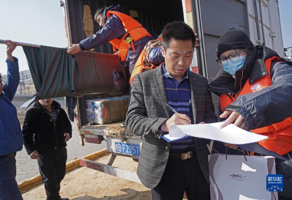 在江西省都昌縣一碼頭,工作人員在進(jìn)行遷移江豚的交接工作(2月15日攝)。