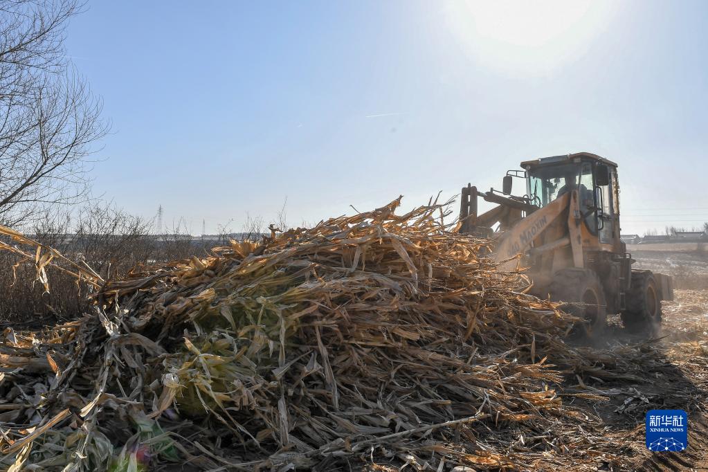 2月16日,在吉林省長(cháng)春市九臺區東湖街道腰站村,隆達興養殖農民專(zhuān)業(yè)合作社農民操作農機整理玉米秸稈。