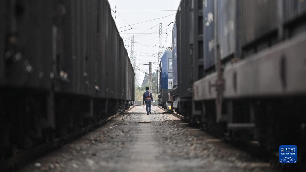 2月15日,一名貨列司機在欽州港站利用貨運調度間隙檢查車(chē)況。
