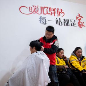 2月16日,在汨羅市歸義鎮友誼河社區“暖心驛站”,志愿者為戶(hù)外勞動(dòng)者義務(wù)剪發(fā)。