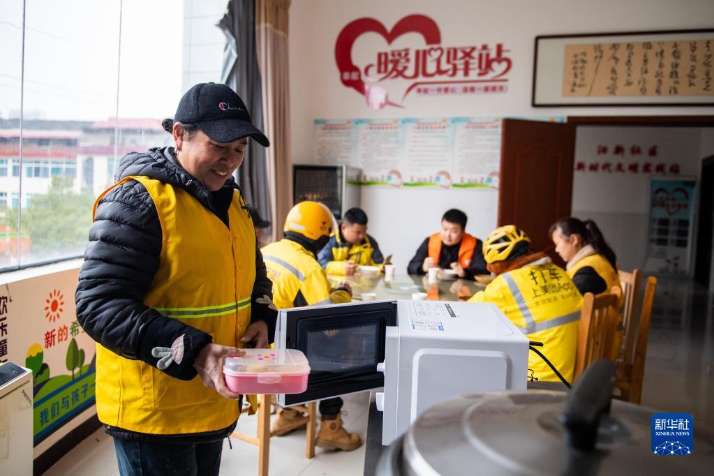 2月16日,在汨羅市歸義鎮汨新社區“暖心驛站”,戶(hù)外勞動(dòng)者使用微波爐加熱午飯。