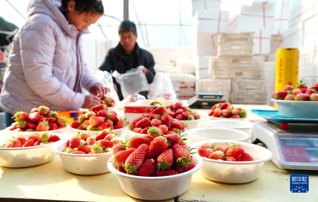 2月16日,在山東省東平縣無(wú)鹽村,村民將采摘的草莓進(jìn)行稱(chēng)重。