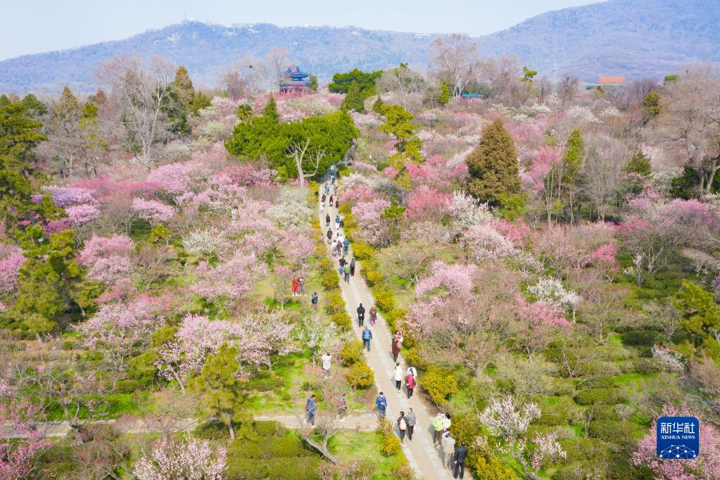 2月16日,游人在南京梅花山賞花(無(wú)人機照片)。