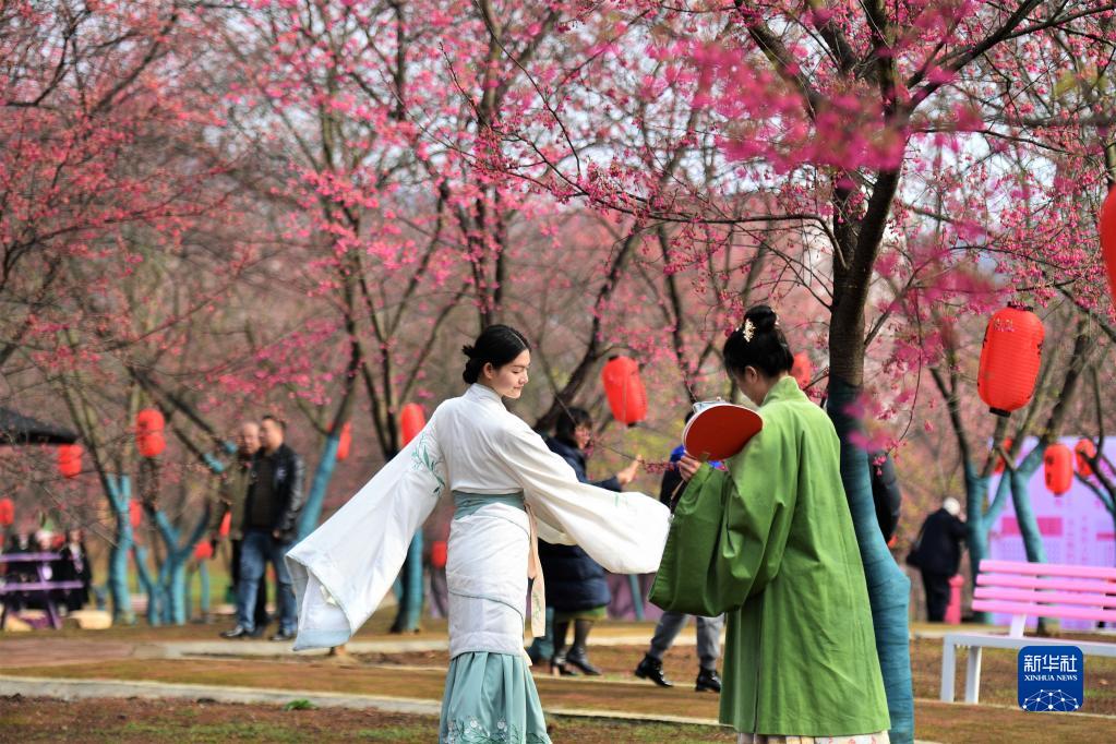 2月16日,游客在湖南省郴州市桂陽(yáng)縣櫻花園賞花。