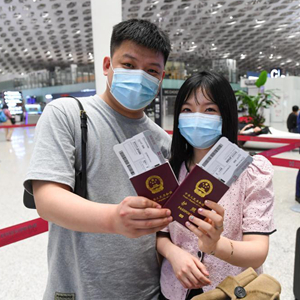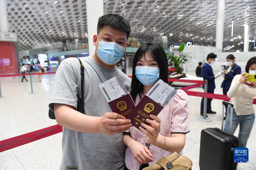 2月12日凌晨,在中國深圳,即將搭乘印尼獅航包機前往巴厘島旅游的游客夫婦拿著(zhù)護照和登機牌合影。