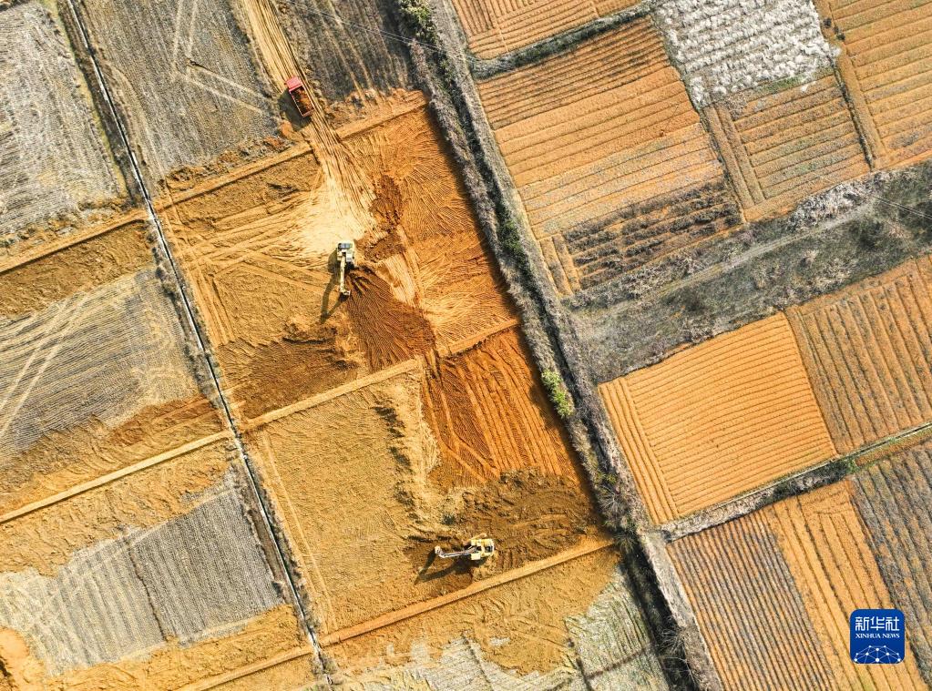 2月16日,在湖南省永州市道縣壽雁鎮芽洞村,工人駕駛挖掘機在高標準農田建設項目現場(chǎng)施工(無(wú)人機照片)。