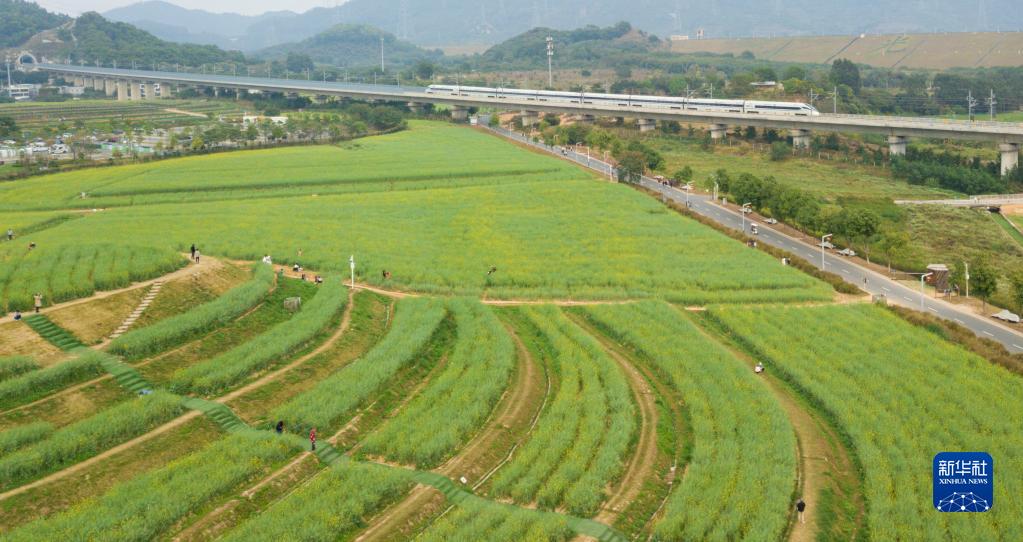 2月16日,和諧號列車(chē)駛過(guò)深圳光明區的油菜花田(無(wú)人機照片)。
