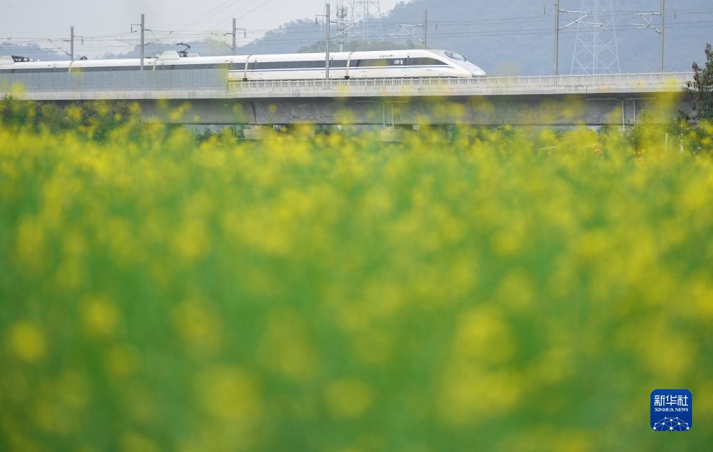 2月16日,和諧號列車(chē)駛過(guò)深圳光明區的油菜花田。