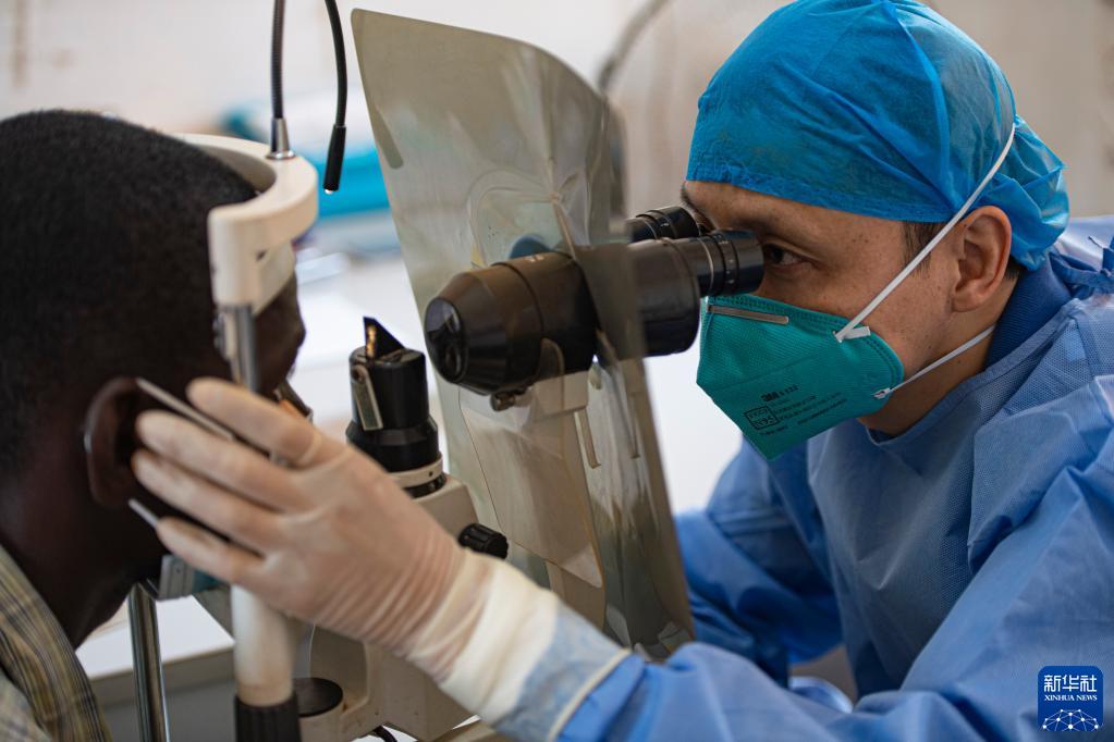 2月13日,在中非共和國首都班吉友誼醫院,第19批援中非中國醫療隊眼科醫生章友美為患者做檢查。