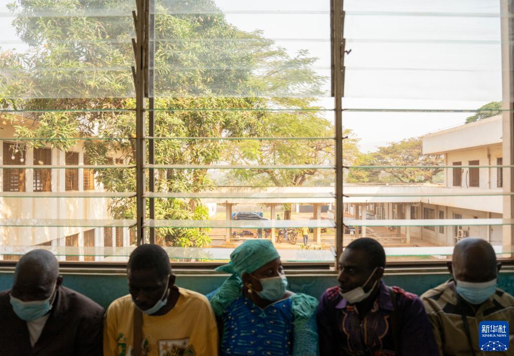 2月13日,人們在中非共和國首都班吉友誼醫院等待中國醫療隊醫生診療。