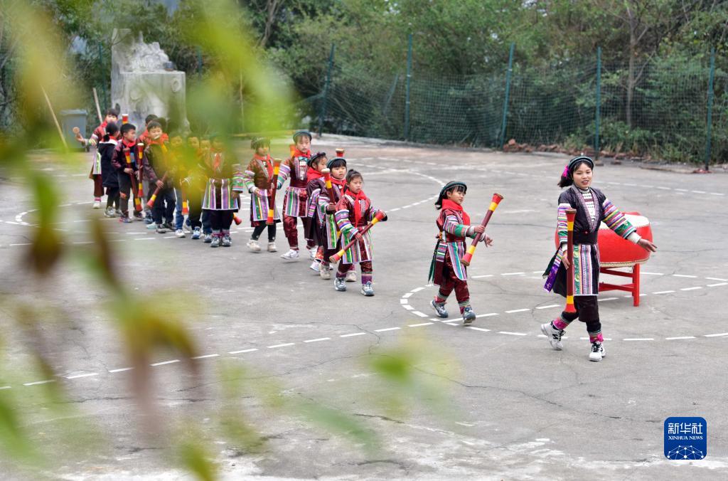 2月16日,貴州省從江縣西山鎮中寨教學(xué)點(diǎn)學(xué)生練習瑤族長(cháng)鼓舞。