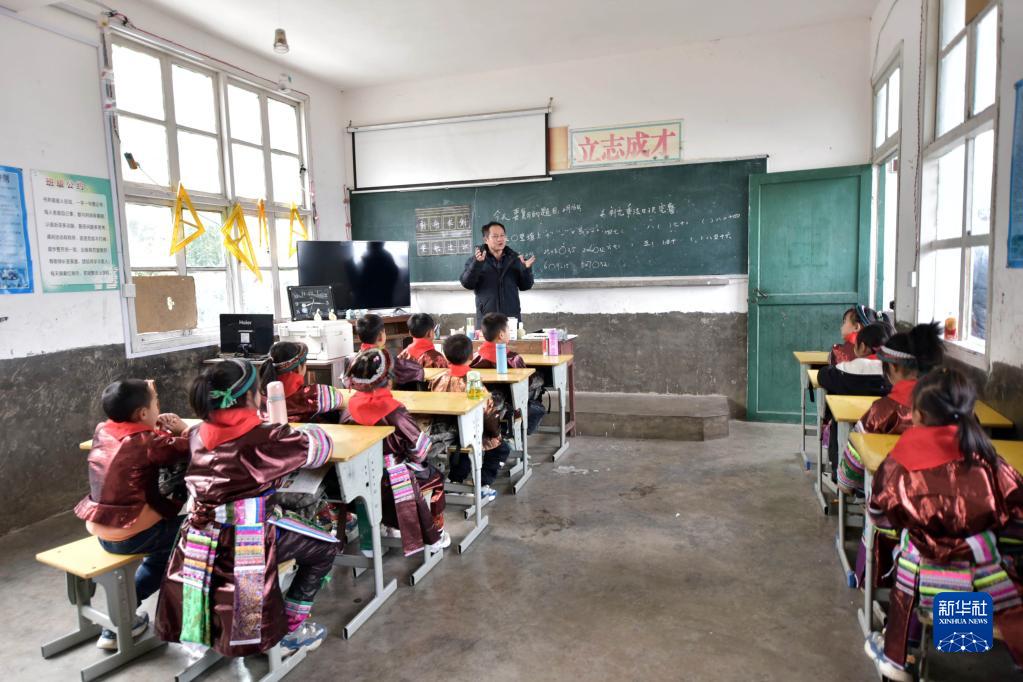2月16日,貴州省從江縣西山鎮中寨教學(xué)點(diǎn)教師孟榮達給學(xué)生上課。