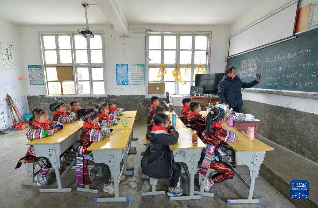 2月16日,貴州省從江縣西山鎮中寨教學(xué)點(diǎn)教師孟榮達給學(xué)生上課。