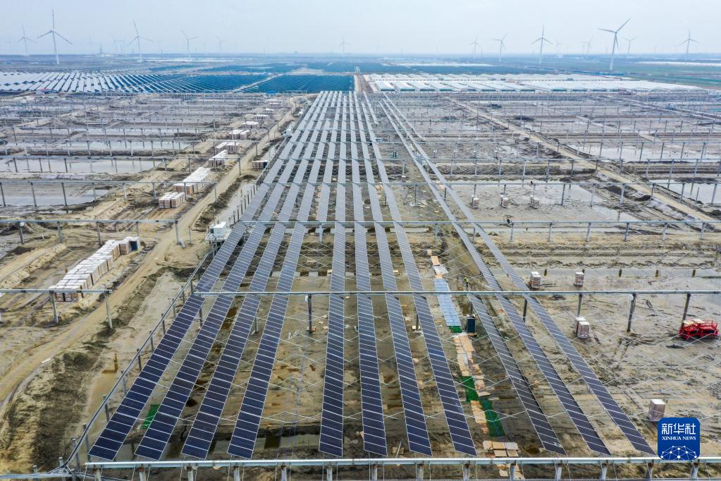 這是2月17日在江蘇省南通市如東縣拍攝的一處“漁光互補”光伏發(fā)電項目施工現場(chǎng)(無(wú)人機照片)。