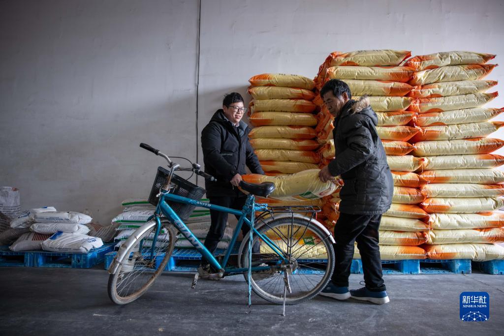 2月17日,農戶(hù)(右)在寧波甬豐農資公司員工的幫助下將購買(mǎi)的化肥抬上自行車(chē)。