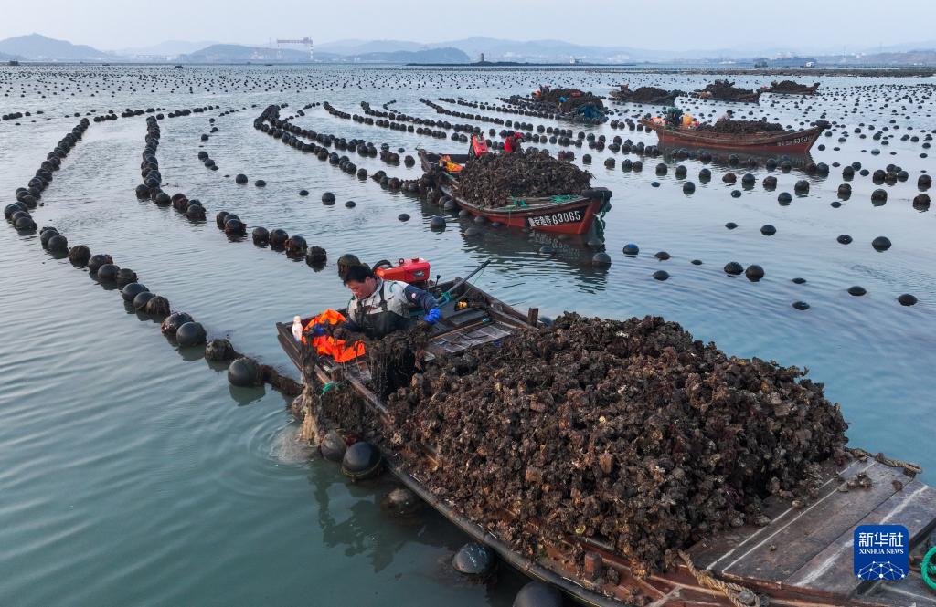 2月17日,在山東威海榮成市俚島灣養殖海區內,漁工在收獲牡蠣。