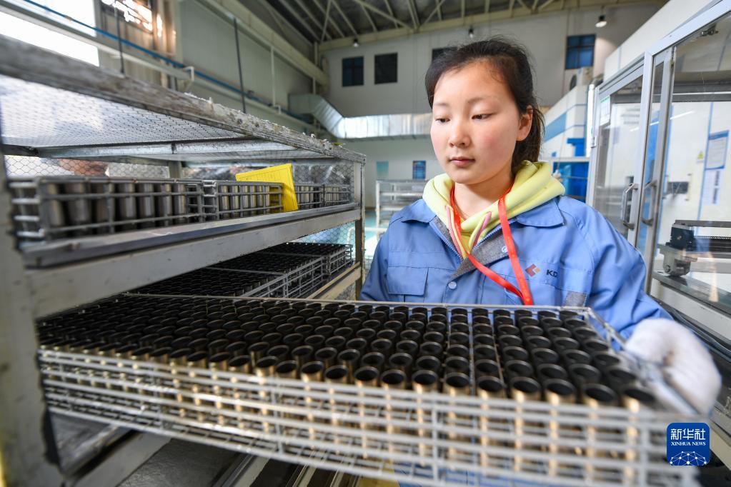 江蘇科達利精密工業(yè)有限公司的工人查看動(dòng)力電池結構件質(zhì)量(2月16日攝)。該公司是新能源汽車(chē)動(dòng)力電池結構件的主要配套廠(chǎng)之一。