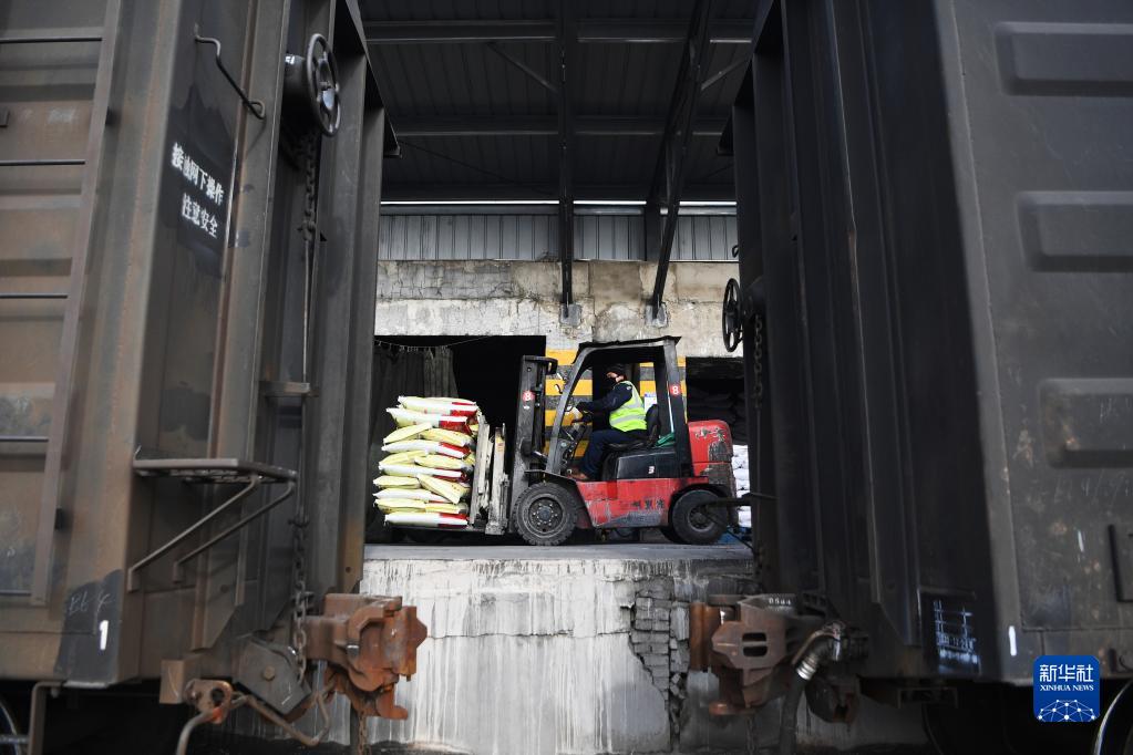 2月17日,在甘肅省金昌市一企業(yè)鐵路專(zhuān)用線(xiàn)上,工作人員在進(jìn)行化肥裝車(chē)作業(yè)。