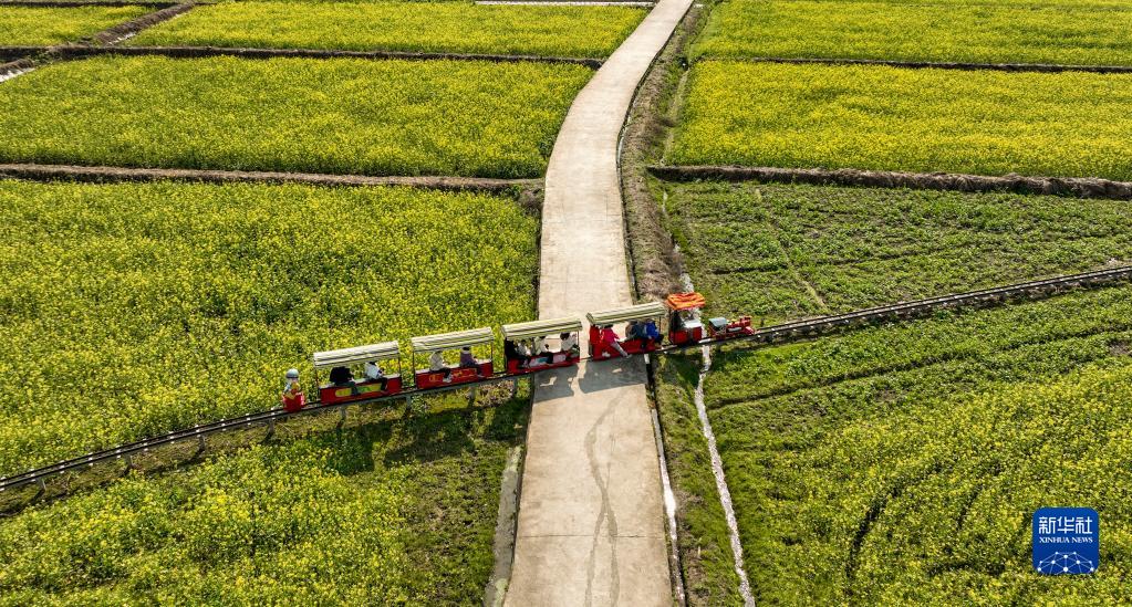 2月17日,游人乘坐觀(guān)光小火車(chē)在福建武夷山五夫鎮油菜花海游覽(無(wú)人機照片)。