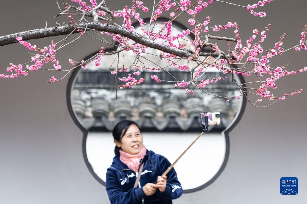 2月17日,游人在南京雨花臺風(fēng)景區拍攝梅花。