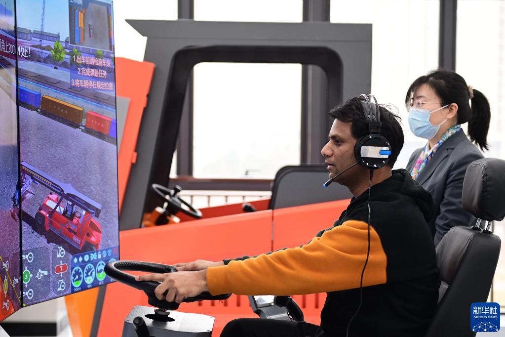 2月17日,在西鐵教育培訓基地,西安交通大學(xué)的印度留學(xué)生樂(lè )輝(前)在貨裝實(shí)訓室體驗模擬駕駛。