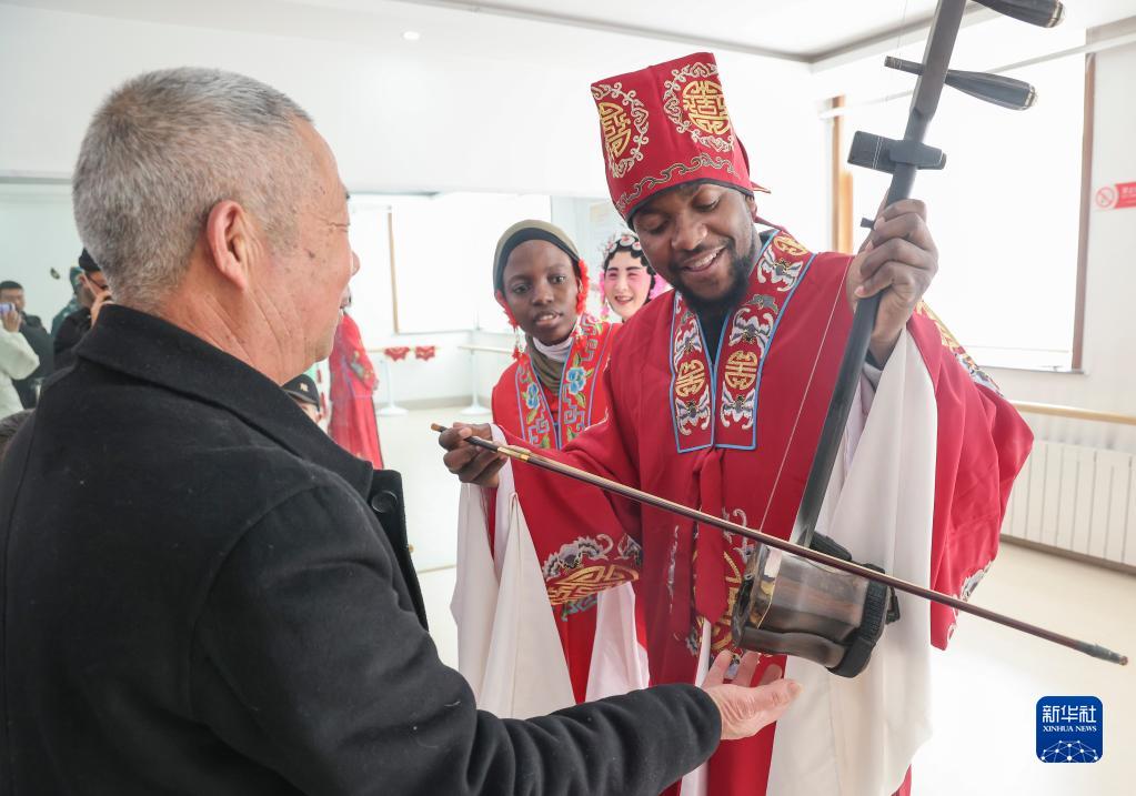 2月17日,在山東省臨沂市蘭山區棗園鎮弦子戲非遺展廳,外國留學(xué)生在民間藝人的指導下體驗二胡演奏。