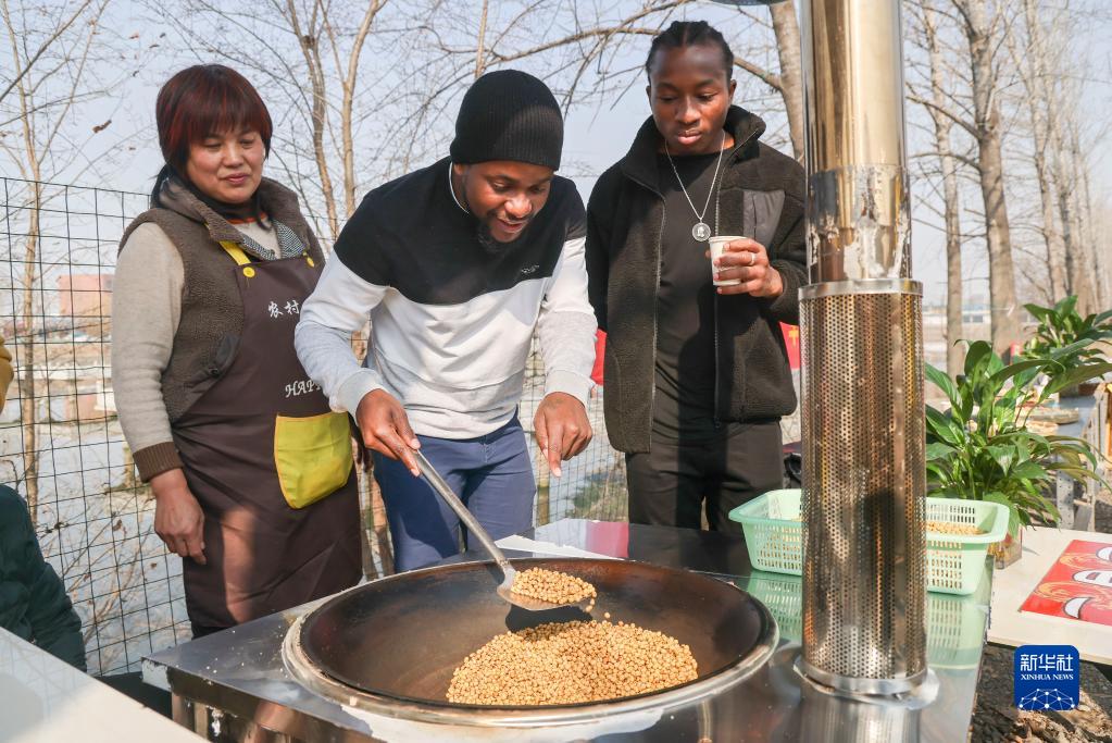 2月17日,在山東省臨沂市蘭山區棗園鎮大棗溝頭村,兩名來(lái)自臨沂大學(xué)的外國留學(xué)生在體驗炒黃豆。